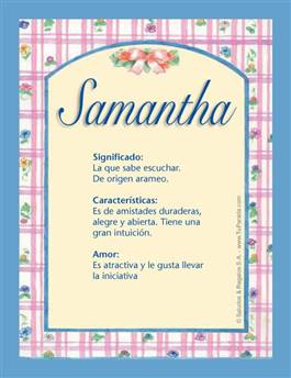Samantha es un nombre de origen inglés que ha ganado popularidad en muchos países de habla hispana. Aunque no tiene una etimología clara, se cree que se deriva de la variante masculina del nombre Samuel, que a su vez proviene del hebreo "Shmuel", que significa "Dios ha escuchado" o "nombre de Dios".